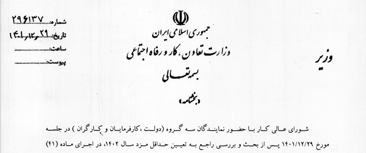 شورای عالی کار در تاریخ 29 اسفند ۱۴۰۱ حداقل مزد کارگران در سال ۱۴۰۲ و نیز میزان افزایش حقوق سایر سطوح مزدی برای کارگران مشمول قانون کار را به شرح زیر تصویب نمود